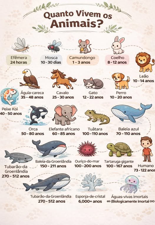Sabe Quanto Vivem os Animais? Publicada por Cris Rodrigues em março 24, 2026 Obter link Facebook X Pinterest Email Outras aplicações Comentários